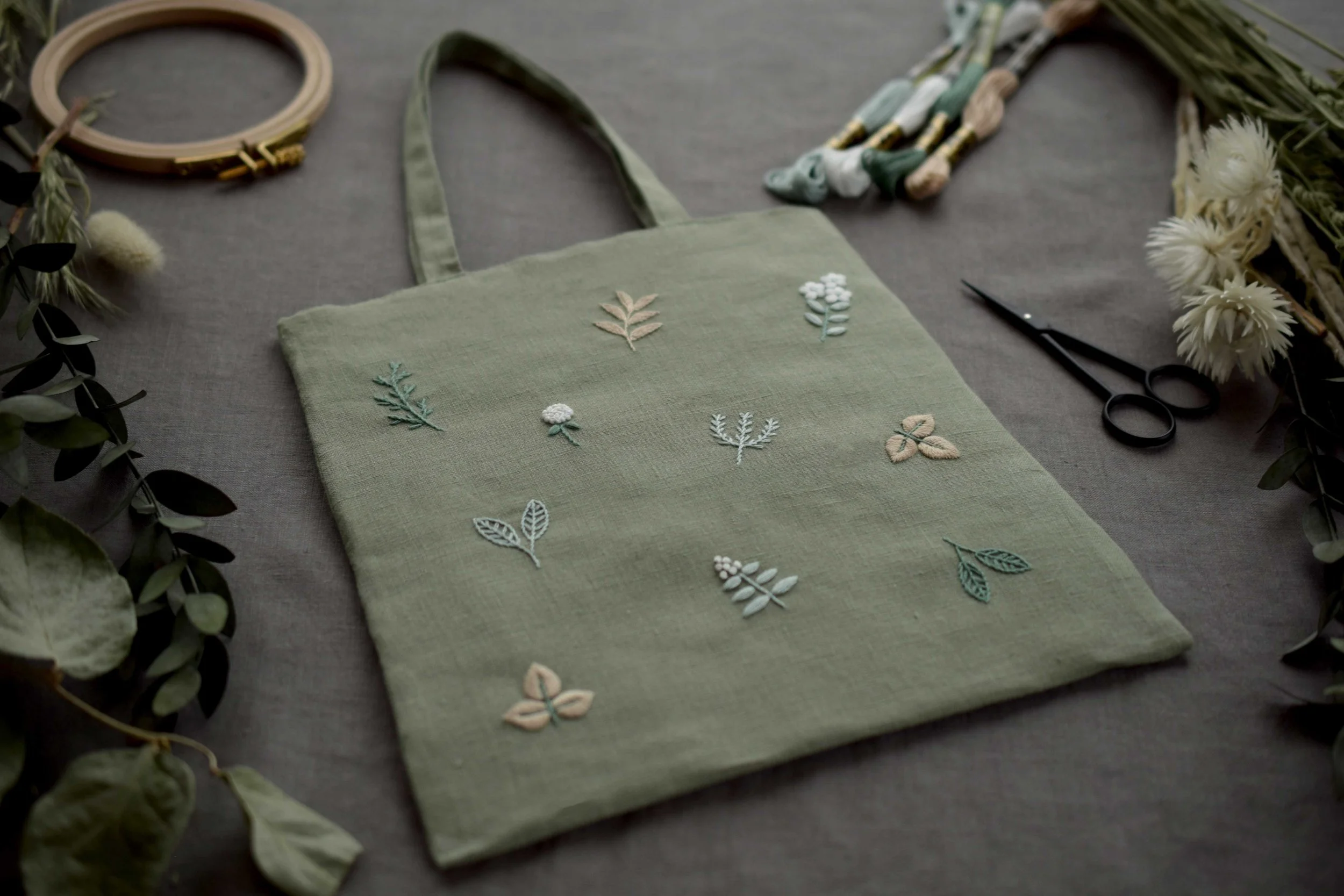 草花のモチーフの図案が印刷されたトートバッグと裏布のセット。トートバックは、ほぼ縫製済みの状態で入っています。刺繍が刺しやすいように、バックの片側だけ開くようになっていますので、刺し終わったら直線を手縫いでとじれば完成です。 紐の部分は、既に縫ってありますのでミシンがなくても大丈夫です。