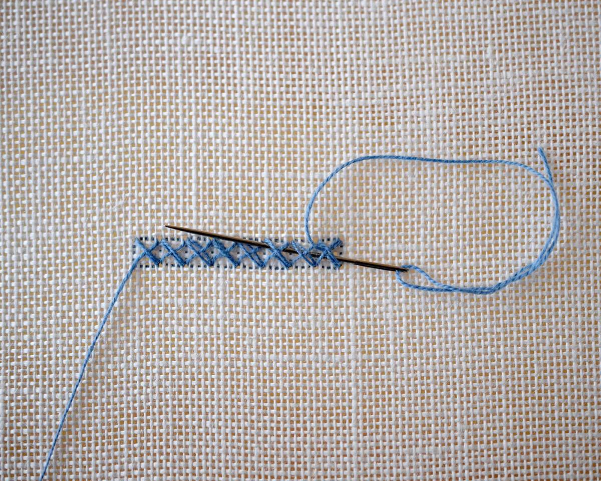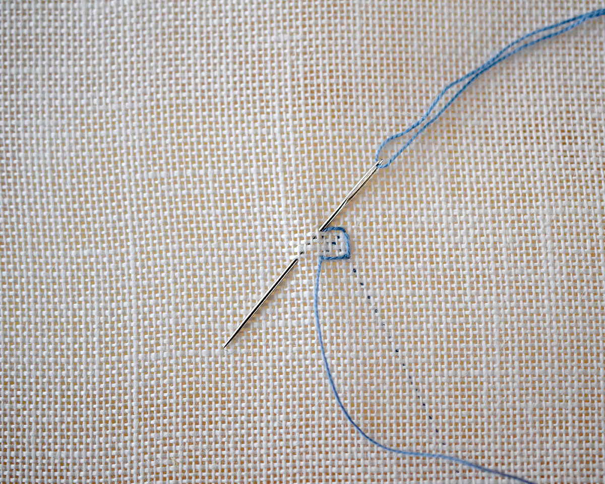 端まで刺したら裏に糸を出し、糸足にくぐらせて糸始末をします。刺し始めの糸も同様に始末します。