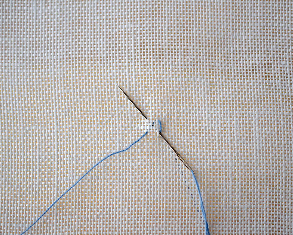 横糸4本真上の穴に針を入れ、左下の角から針を出して斜めにすくいます。