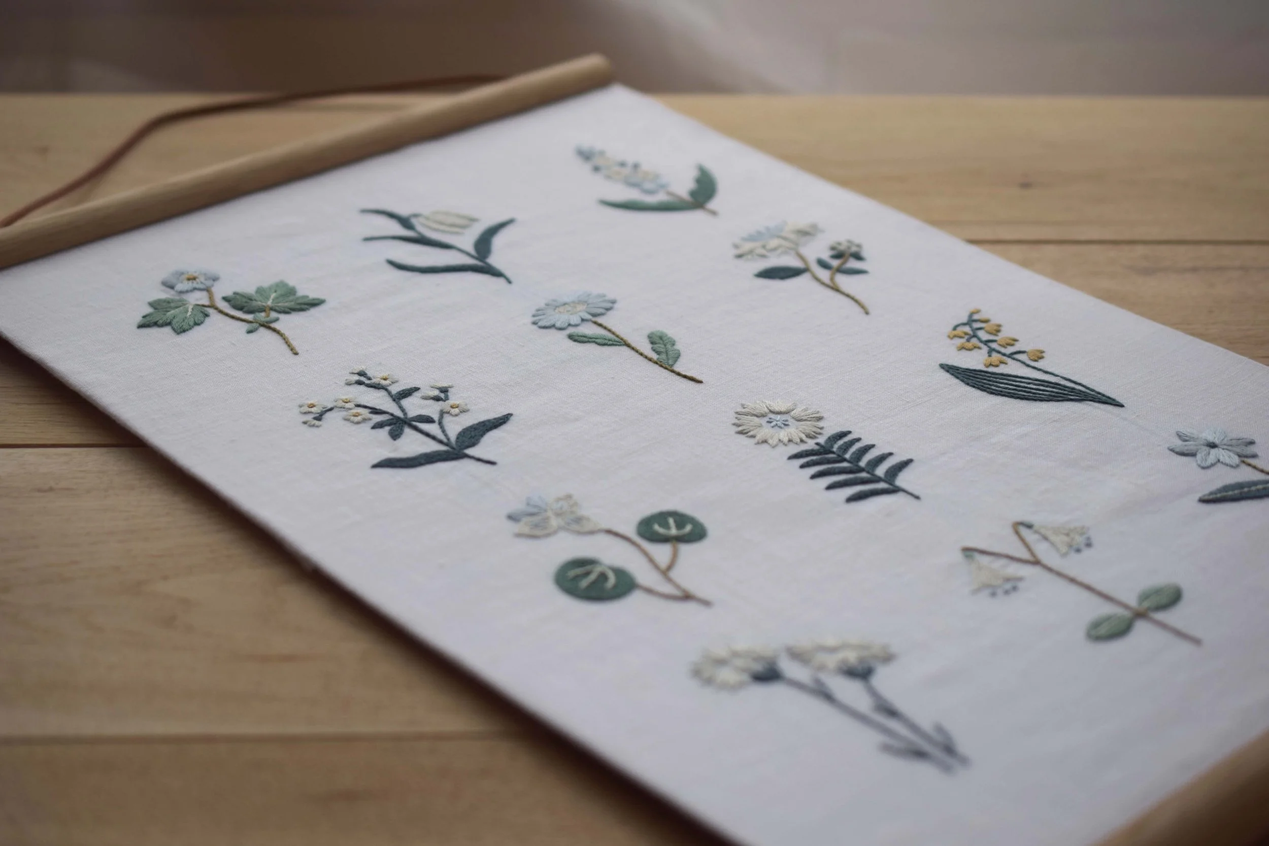草花のモチーフを刺繍しながらお部屋に飾れるタペストリーづくりができるレッスンです。