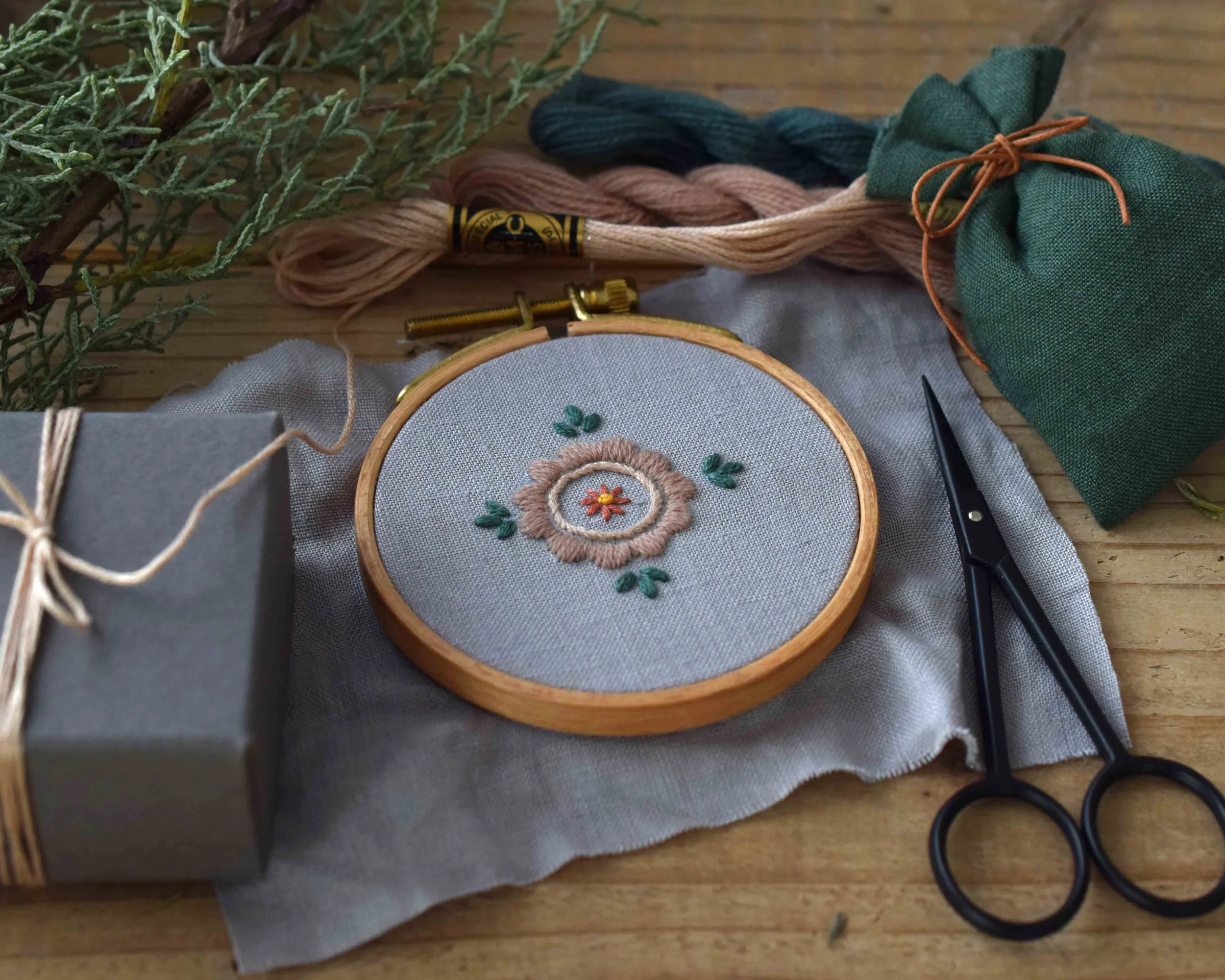 全7回でブローチ、サシェ、ギフトカード、巾着、オーバル刺繍枠の飾りなど、小さな贈り物にもできる作品づくりをします。