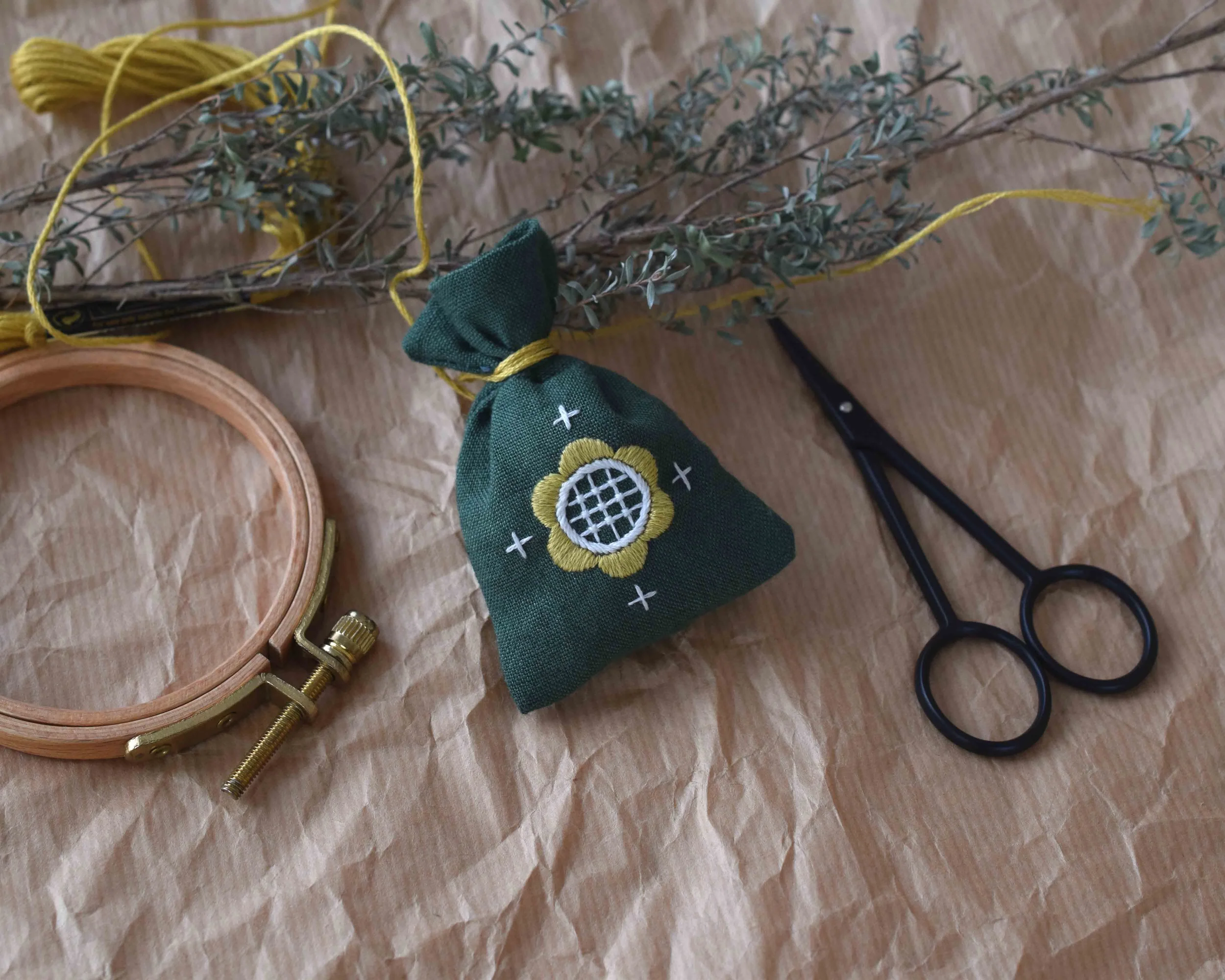 花模様の中に格子柄を刺していくハランド刺繍。ハーブを入れて小さなサシェに。